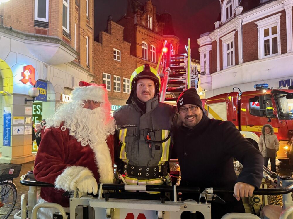 Kurz darauf richteten sich alle Blicke nach oben: Über der Einhorn-Apotheke war eine rote Mütze mit weißem Bart zu sehen – der Nikolaus! Doch er befand sich in luftiger Höhe und benötigte Unterstützung, um sicher zum Marktplatz zu gelangen. Die Freiwillige Feuerwehr Husum war zur Stelle und leitete mit ihrer Drehleiter die „Rettungsaktion“ ein. Vorsichtig stieg der Nikolaus in den Korb, ebenso wie die prall gefüllten Jutesäcke voller süßer Überraschungen.